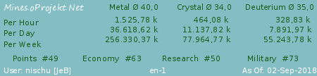 | Name | Metal mine | Production | Crystal Mine | Production | Deuterium mine | Production | Ø |